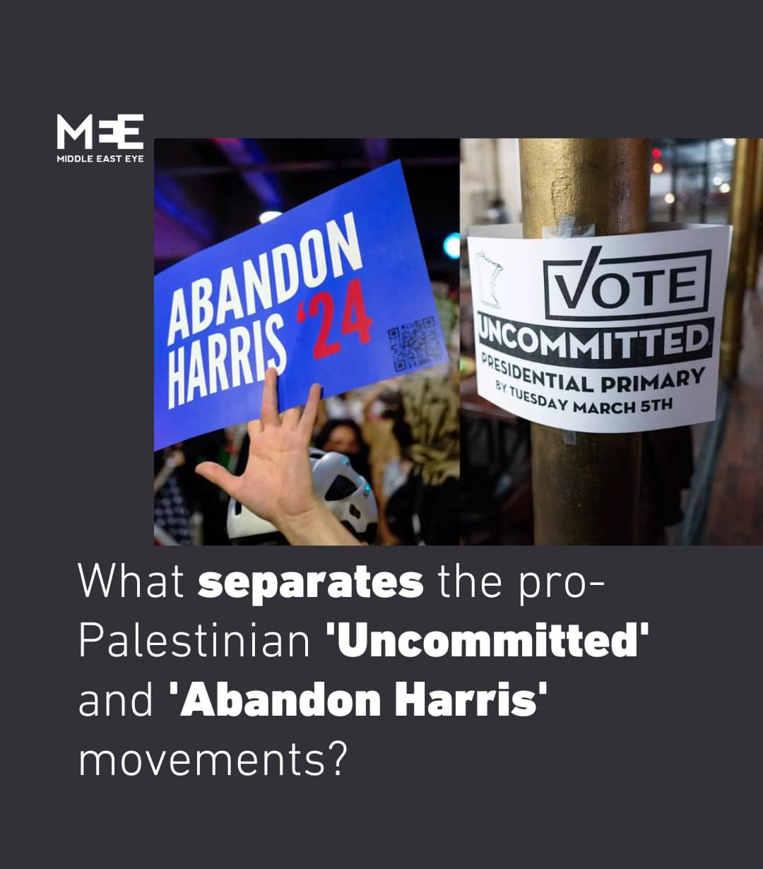Uncommitted kini sepenuhnya berintegrasi dengan Partai Demokrat, meskipun administrasi Demokrat masih memberikan dukungan militer untuk perang Israel di Gaza. Perang ini telah mengakibatkan lebih dari 40.000 warga Palestina tewas dan menghancurkan sebagian besar wilayah yang terkepung. Di sisi lain, Abandon Harris berusaha menemukan jalur di luar Partai Demokrat maupun Partai Republik, yang keduanya sepenuhnya berkomitmen pada Israel.