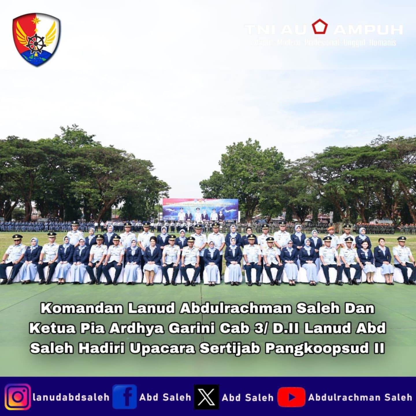 Di kesempatan yang sama, jabatan Ketua PIA Ardhya Garini Daerah II Koopsud II juga diserahterimakan dari Ny. Lulu Budhi Achmadi kepada Ny. Siska Deni Hasoloan S, yang dilakukan oleh Ketua PIA Ardhya Garini Gabungan Koopsudnas, Ny. Dewi Tedi Rizalihadi.