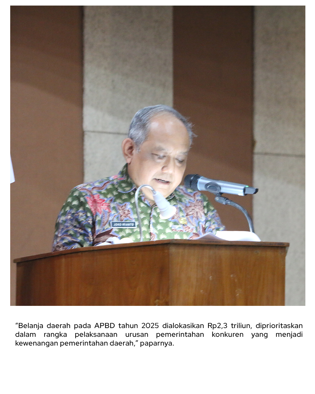 “Belanja daerah pada APBD tahun 2025 dialokasikan Rp2,3 triliun, dan diprioritaskan untuk pelaksanaan urusan pemerintahan yang menjadi kewenangan daerah,” jelas Joko Irianto.