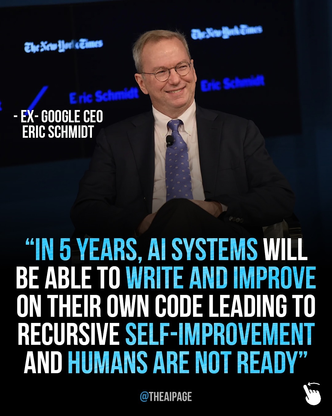 Mantan CEO Google, Eric Schmidt, memberikan peringatan yang mengejutkan tentang masa depan kecerdasan buatan (AI). Menurutnya, dalam waktu lima tahun, AI dapat menulis dan meningkatkan kodenya sendiri, menciptakan siklus perbaikan diri yang terus menerus.