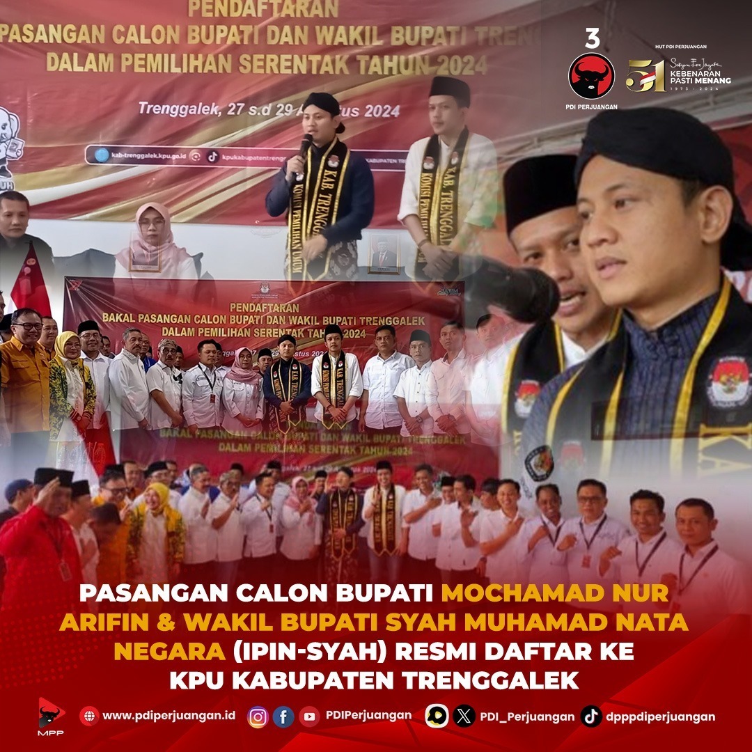 Mochamad Nur Arifin dan Syah Mohammad Natanegara, yang akrab dipanggil Ipin-Syah, telah resmi mendaftar ke Komisi Pemilihan Umum (KPU) Kabupaten Trenggalek. Mereka merupakan bakal pasangan calon untuk pemilihan kepala daerah (Pilkada) pada tahun 2024 mendatang.