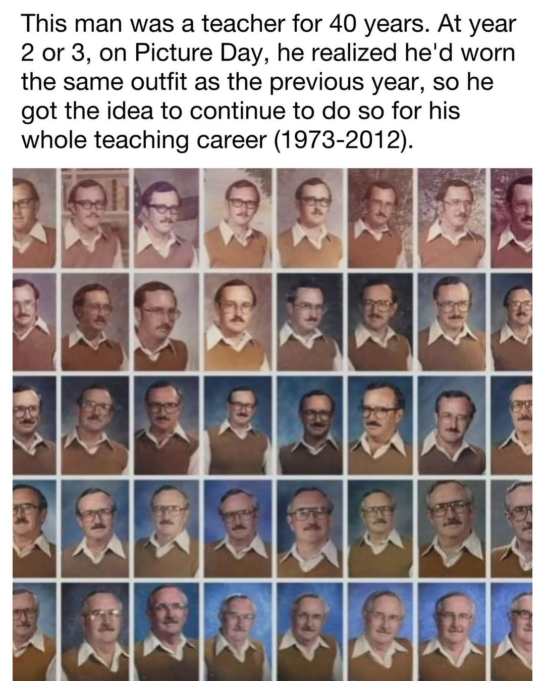Pada hari itu, guru tersebut menyadari bahwa ia mengenakan pakaian yang sama seperti tahun sebelumnya. Hal ini membuatnya berpikir, mengapa tidak terus mengenakan pakaian yang sama setiap tahun? Sejak saat itu, ia memutuskan untuk mengenakan outfit yang sama untuk setiap hari pemotretan selama karir mengajarnya.