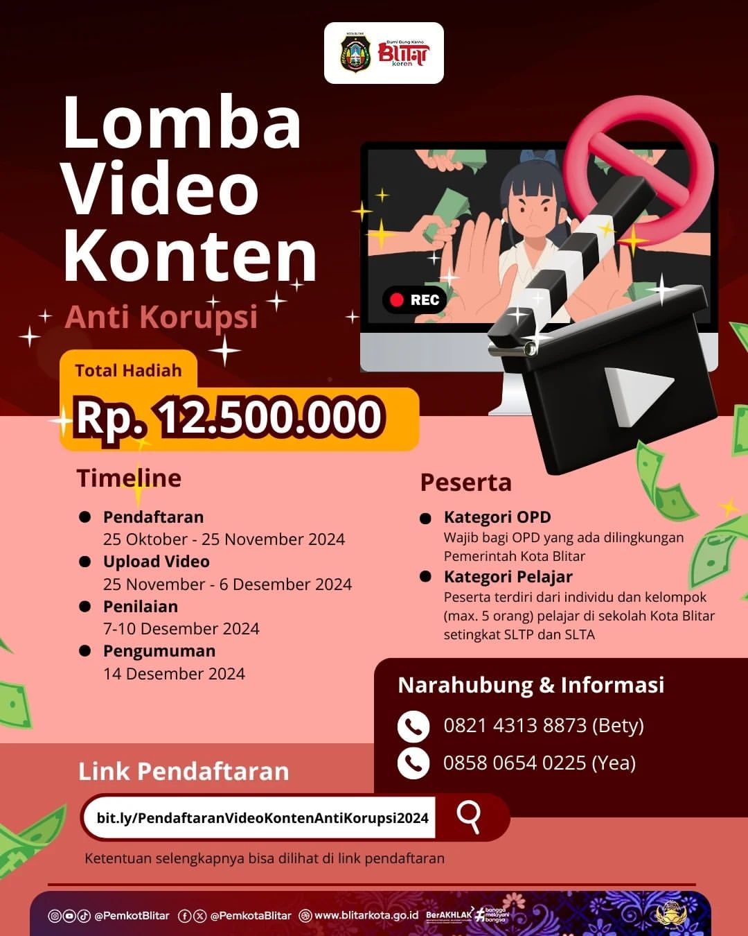 Pemerintah Kota Blitar mengajak seluruh masyarakat untuk berpartisipasi dalam lomba video konten anti-korupsi. Lomba ini bertujuan untuk meningkatkan kesadaran akan pentingnya integritas dan kejujuran di kalangan masyarakat, terutama generasi muda.