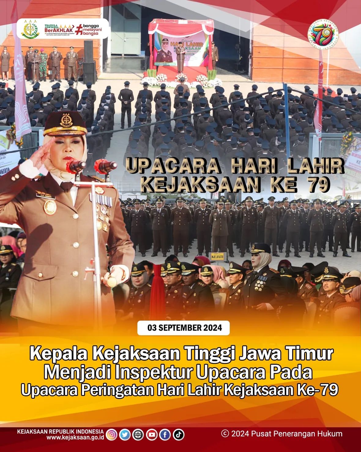 Hari Senin, tanggal 2 September 2024, menjadi momen bersejarah bagi Kejaksaan Republik Indonesia. Kejaksaan Tinggi Jawa Timur (Kejati Jatim) menggelar upacara untuk memperingati Hari Lahir Kejaksaan yang ke-79. Upacara ini berlangsung di Mojokerto dan dipimpin oleh Dr. Mia Amiati, SH, MH, CMA, CSSL, yang menjabat sebagai Kepala Kejati Jatim.