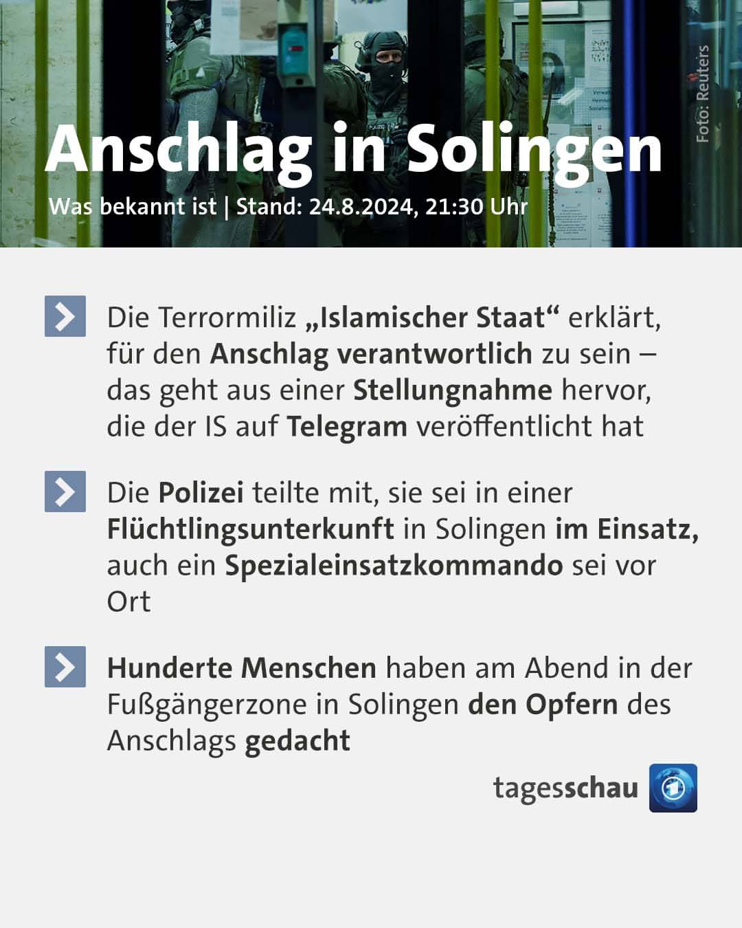 Pada malam 24 Agustus 2024, sebuah serangan mematikan terjadi di Solingen, Jerman, yang mengakibatkan tiga orang tewas dan delapan lainnya terluka. Menyusul insiden yang menggemparkan ini, pihak kepolisian melakukan penangkapan di sebuah tempat penampungan pengungsi. Seorang juru bicara polisi mengkonfirmasi penangkapan tersebut namun belum memberikan informasi lebih lanjut mengenai identitas tersangka.