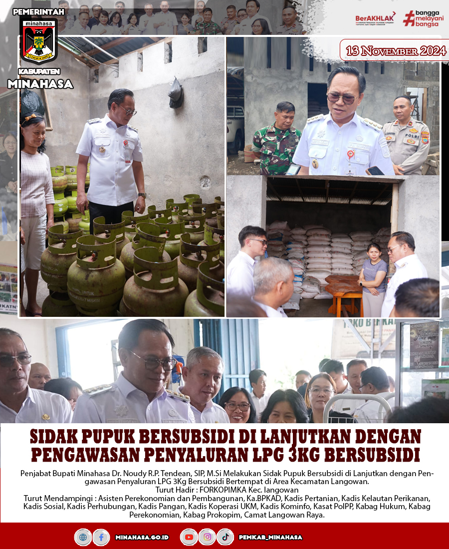 Minahasa, 15 November 2024 – Penjabat Bupati Minahasa, Dr. Noudy R.P. Tendean, SIP, M.Si, melakukan inspeksi mendadak (sidak) terhadap penyaluran pupuk bersubsidi di Kecamatan Langowan. Kegiatan ini bertujuan untuk memastikan bahwa pupuk yang disalurkan tepat sasaran dan dapat membantu petani di daerah tersebut.