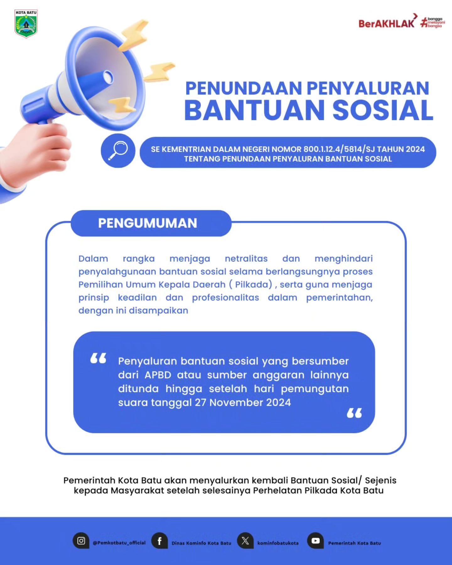 Plt. Kepala Dinas Sosial Kota Batu, MD Forkan, berharap kebijakan ini dapat menjaga netralitas dalam pelaksanaan Pilkada di Kota Batu. Dengan adanya penundaan ini, diharapkan masyarakat dapat merasa lebih aman dan terhindar dari potensi penyalahgunaan bansos selama masa kampanye.