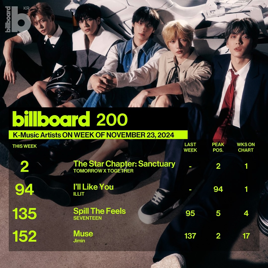 Pada tanggal 23 November, beberapa artis K-Pop berhasil masuk ke dalam tangga lagu Billboard 200, sebuah chart yang sangat dihormati di industri musik global. Di antara mereka, TOMORROW X TOGETHER (TXT) mencatat prestasi yang mengesankan dengan debut mereka di peringkat kedua melalui EP terbaru mereka yang berjudul The Star Chapter: Sanctuary.