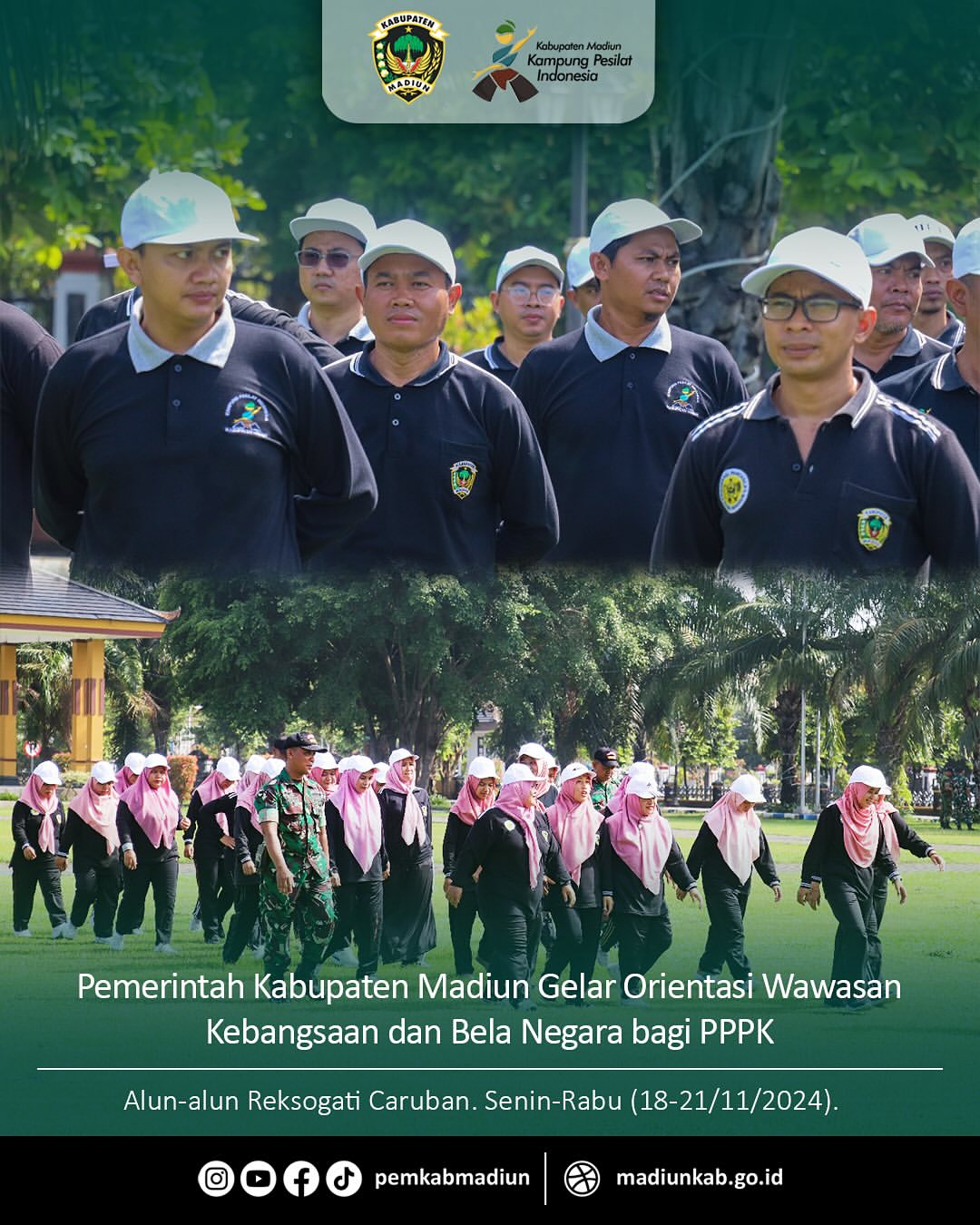 Pemerintah Kabupaten Madiun melalui akun resmi @bkpsdmkabmadiun telah menyelenggarakan kegiatan bertajuk Wawasan Kebangsaan dan Bela Negara. Acara ini diselenggarakan sebagai bagian dari Orientasi Pegawai Pemerintah dengan Perjanjian Kerja (PPPK) Tahun 2024. Kegiatan ini berlangsung di Alun-Alun Reksogati, Caruban, dan melibatkan 1.982 pegawai PPPK dari berbagai formasi.