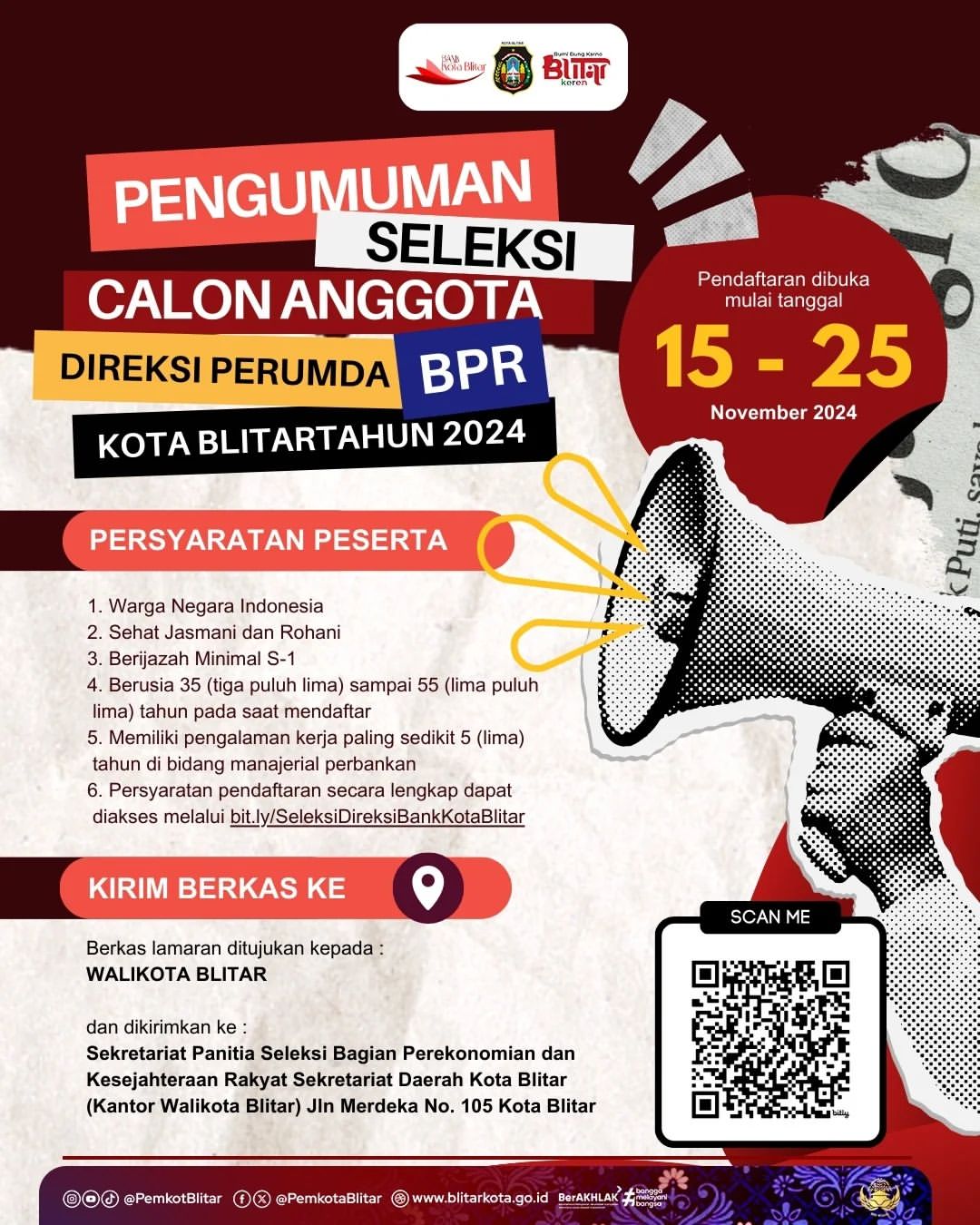 Perumda BPR Kota Blitar sedang membuka peluang bagi para pencari kerja untuk menjadi anggota direksi. Kegiatan perekrutan ini bertujuan untuk menemukan pemimpin yang kompeten dalam mengelola lembaga perbankan daerah.