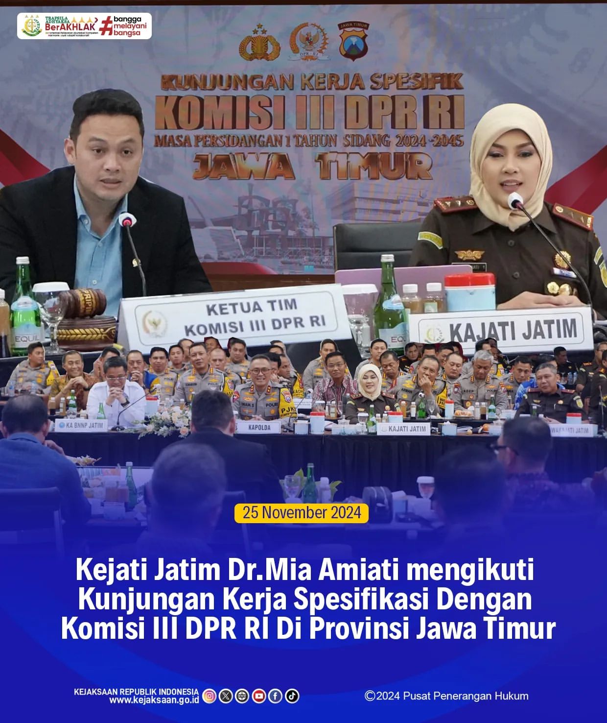 Jawa Timur, 22 November 2024 - Kepala Kejaksaan Tinggi Jawa Timur, Dr. Mia Amiati, SH., MH., CMA., CSSL, menghadiri kunjungan kerja spesifikasi bersama Komisi III DPR RI di Gedung Mahameru Mapolda Jawa Timur. Kegiatan ini diadakan untuk membahas berbagai masalah dalam penegakan hukum di provinsi tersebut.