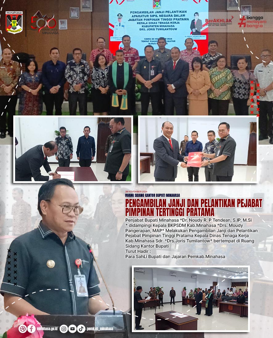 Pada hari ini, Penjabat Bupati Minahasa, Dr. Noudy R. P Tendean, S.IP, M.Si, melaksanakan pelantikan pejabat baru di lingkungan pemerintahan Kabupaten Minahasa. Acara ini berlangsung di Ruang Sidang Kantor Bupati dan dihadiri oleh berbagai pejabat penting lainnya, termasuk Kepala BKPSDM Kabupaten Minahasa, Drs. Moudy Pangerapan, MAP.