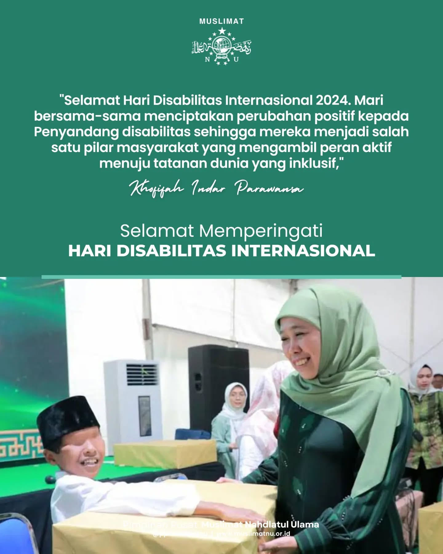 "Selamat Hari Disabilitas Internasional 2024. Mari bersama-sama menciptakan perubahan positif bagi penyandang disabilitas sehingga mereka menjadi salah satu pilar masyarakat yang mengambil peran aktif menuju tatanan dunia yang inklusif," ucap Khofifah.