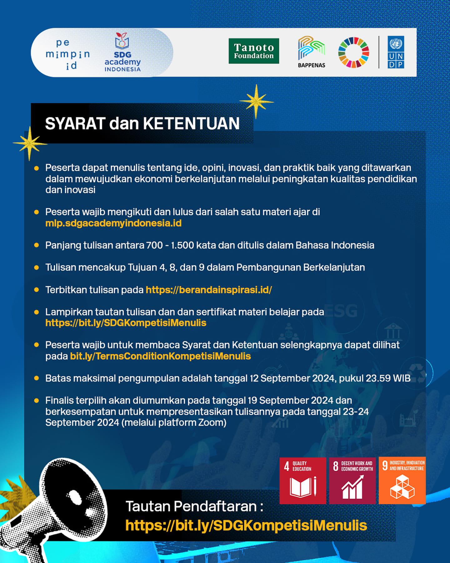 Pada tanggal 23 Agustus hingga 12 September 2024, SDG Academy Indonesia bersama Pemimpin.id mengundang mahasiswa S1 dan masyarakat umum yang berusia 17 tahun ke atas untuk berpartisipasi dalam kompetisi menulis. Kompetisi ini diadakan dalam rangka memperingati Hari Literasi Internasional dan Konferensi Tahunan SDGs 2024.