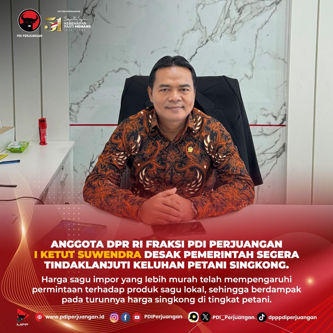 Jakarta, 17 Desember 2024 - Anggota Komisi IV DPR RI dari Fraksi PDI Perjuangan, I Ketut Suwendra, mendesak pemerintah pusat dan pemerintah daerah untuk segera menanggapi keluhan yang disampaikan oleh petani singkong. Hal ini dikarenakan harga singkong yang terus menurun, yang disebabkan oleh adanya sagu impor yang lebih murah.