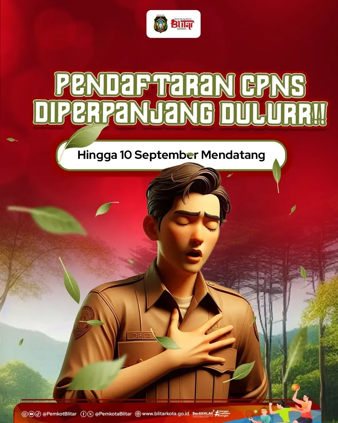 Kota Blitar, 5 September 2024 - Badan Kepegawaian dan Pengembangan Sumber Daya Manusia (BKPSDM) Kota Blitar mengumumkan perpanjangan pendaftaran Calon Pegawai Negeri Sipil (CPNS) hingga 10 September 2024. Sebelumnya, pendaftaran CPNS ini dijadwalkan ditutup pada 6 September.