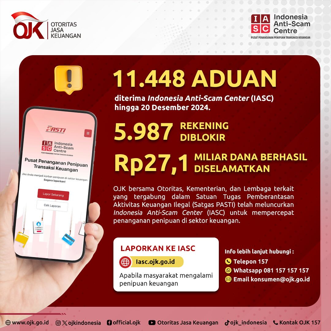 Hingga tanggal 20 Desember 2024, Indonesia Anti-Scam Center (IASC) telah menerima sebanyak 11.448 aduan terkait penipuan di sektor keuangan. Dari jumlah tersebut, IASC berhasil memblokir 5.987 rekening yang diduga terlibat dalam aktivitas penipuan. Selain itu, IASC juga berhasil menyelamatkan dana masyarakat sebesar Rp27,1 miliar.