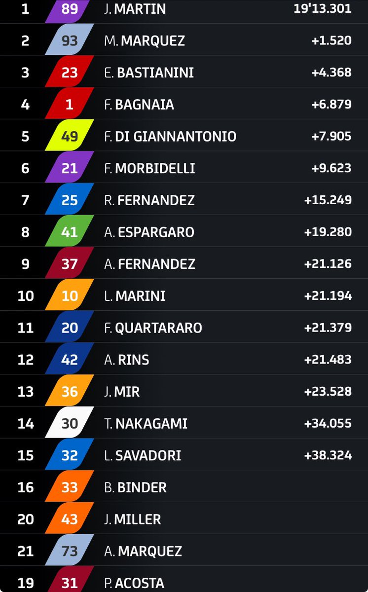 Dalam balapan ini, Francesco Bagnaia menyelesaikan balapan di tempat keempat, yang berpengaruh pada klasemen juara dunia. Kemenangan Martin membuatnya kini unggul 16 poin dari Bagnaia. Fabio Di Giannantonio juga menunjukkan performa baik dengan meraih posisi kelima.