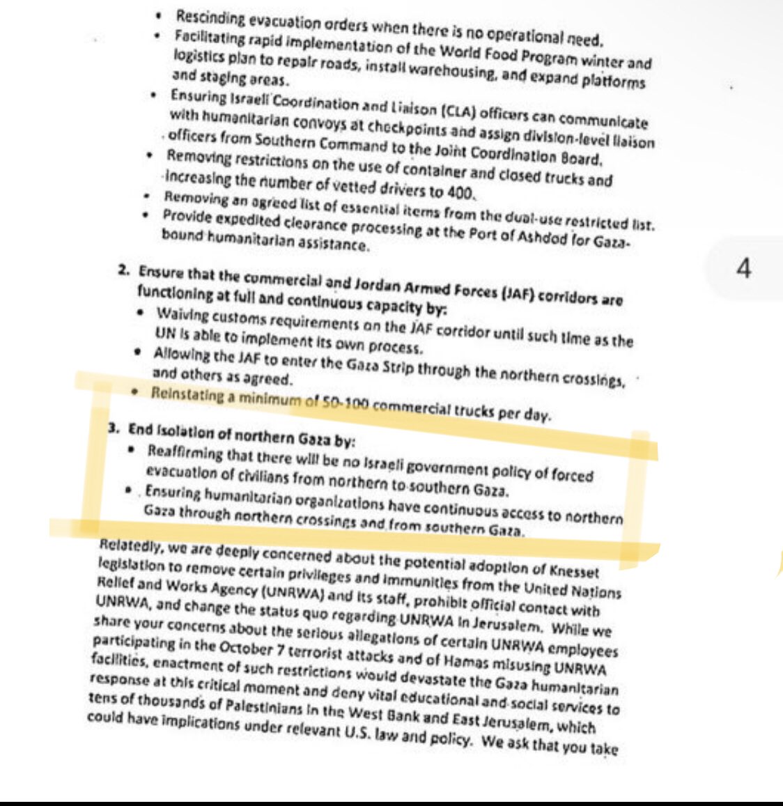 Pasukan Israel saat ini sedang melakukan pengusiran paksa terhadap keluarga-keluarga dari rumah mereka di Gaza utara. Pengusiran ini juga terjadi di tempat penampungan yang dikelola oleh PBB, yang kini digunakan sebagai tempat perlindungan. Aksi militer ini bertentangan dengan surat terbaru dari Menteri Luar Negeri AS, Anthony Blinken, dan Menteri Pertahanan, Lloyd Austin. Dalam surat tersebut, mereka meminta Israel untuk "mengakhiri isolasi Gaza utara" dan memastikan tidak ada kebijakan evakuasi paksa warga sipil dari utara ke selatan Gaza.