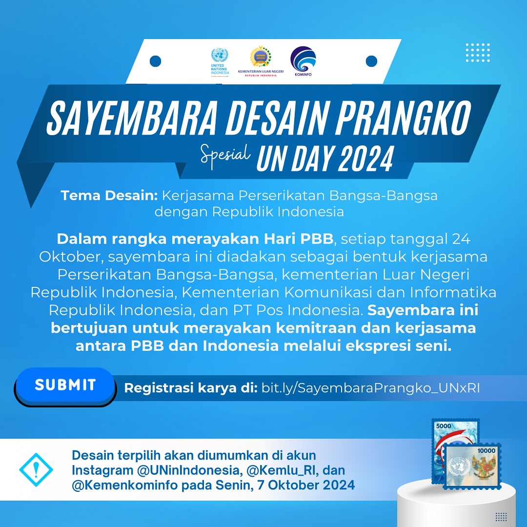 Dalam rangka merayakan Hari Perserikatan Bangsa-Bangsa (PBB) yang diperingati setiap tahun pada tanggal 24 Oktober, Indonesia mengadakan Sayembara Desain Prangko dengan tema "Kerjasama Perserikatan Bangsa-Bangsa dengan Republik Indonesia". Acara ini memberikan kesempatan kepada siswa-siswa muda untuk menyalurkan kreativitas mereka dan berkontribusi dalam merayakan hubungan antara Indonesia dan PBB.