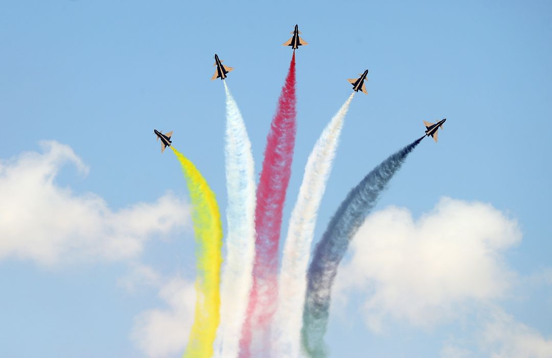 Tim akrobatik Angkatan Udara Pembebasan Rakyat China, yang dikenal dengan nama tim August 1st, melakukan pertunjukan spektakuler di langit Mesir. Pertunjukan akrobatik militer adalah pementasan yang melibatkan pesawat tempur melakukan manuver berbahaya dan menampilkan keahlian pilot yang tinggi.