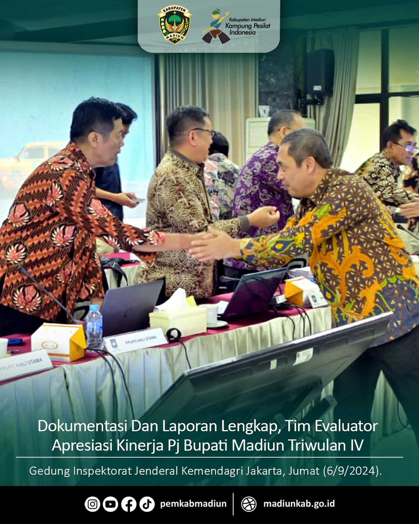 Penjabat (PJ) Bupati Madiun, Tontro Pahlawanto, baru-baru ini menghadiri evaluasi kinerja tahap IV. Kegiatan ini berlangsung di ruang rapat utama Gedung Inspektorat Jenderal Kementerian Dalam Negeri (Kemendagri) di Jakarta. Evaluasi ini dilakukan oleh tim evaluator dari Inspektorat Jenderal Kemendagri.