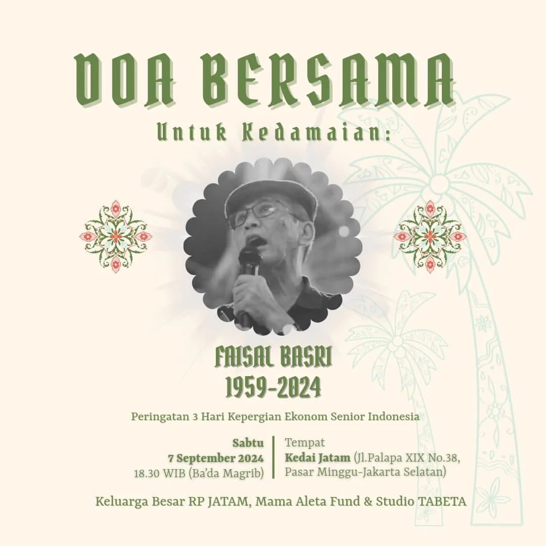 Pada hari ini, masyarakat diundang untuk menghadiri acara doa bersama dalam rangka mengenang almarhum Faisal Basri, seorang tokoh ekonomi yang sangat peduli terhadap kesejahteraan masyarakat. Acara ini merupakan peringatan tiga hari setelah kepergian beliau, yang meninggal pada tahun 2024. Ini adalah kesempatan untuk berkumpul dan mendoakan kedamaian bagi almarhum.