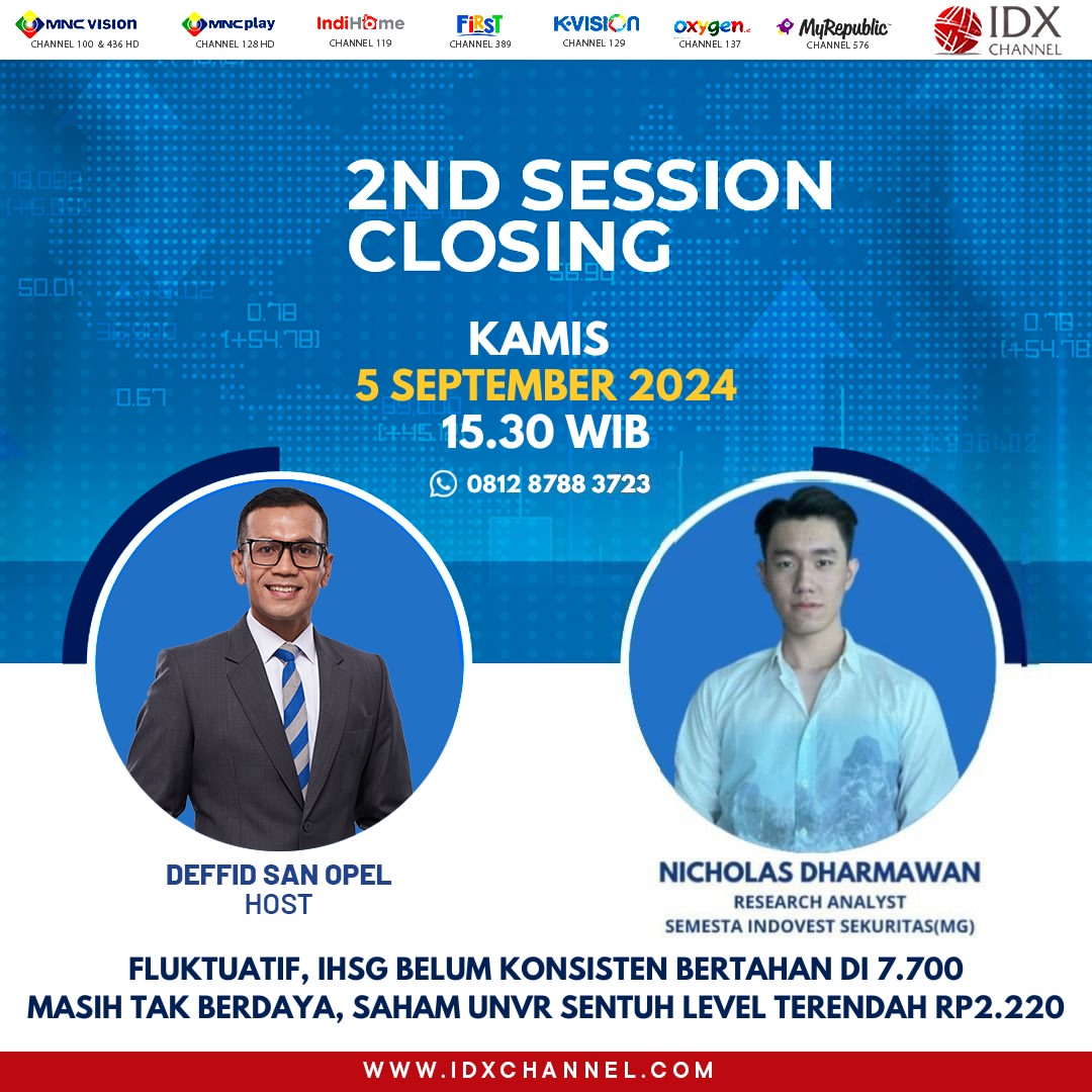 Dengan kondisi IHSG yang belum mampu bertahan di level 7.700-an, banyak yang bertanya-tanya ke mana arah suasana pasar selanjutnya. Untuk informasi lebih lanjut mengenai rekomendasi saham UNVR yang saat ini berada di level terendah, saksikan pembahasan di IDX 2nd session closing sore ini pukul 15:30 WIB. Siaran ini dapat disaksikan secara langsung di IDX Channel atau melalui berbagai platform televisi lainnya.