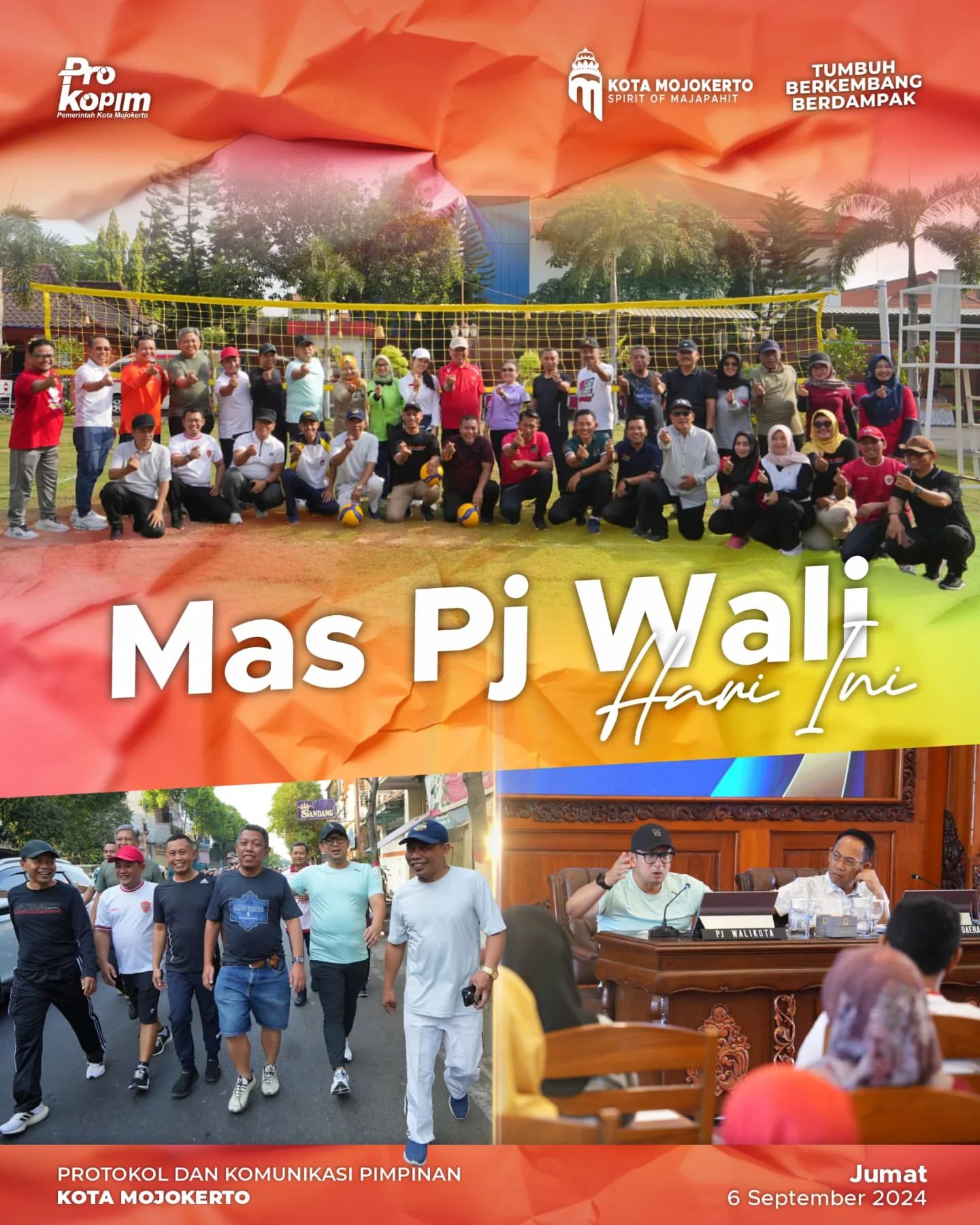 Pada Jumat, 6 September 2024, Penjabat (Pj) Wali Kota Mojokerto, Moh. Ali Kuncoro, menghadiri acara Olahraga Bersama yang diadakan di Lapangan Sasana Praja Abhipraya, Balai Kota Mojokerto. Kegiatan ini merupakan bagian dari rangkaian acara yang mencakup jalan sehat dan pertandingan persahabatan voli antara Pemerintah Kota Mojokerto dan Dewan Perwakilan Rakyat Daerah (DPRD) Kota Mojokerto.