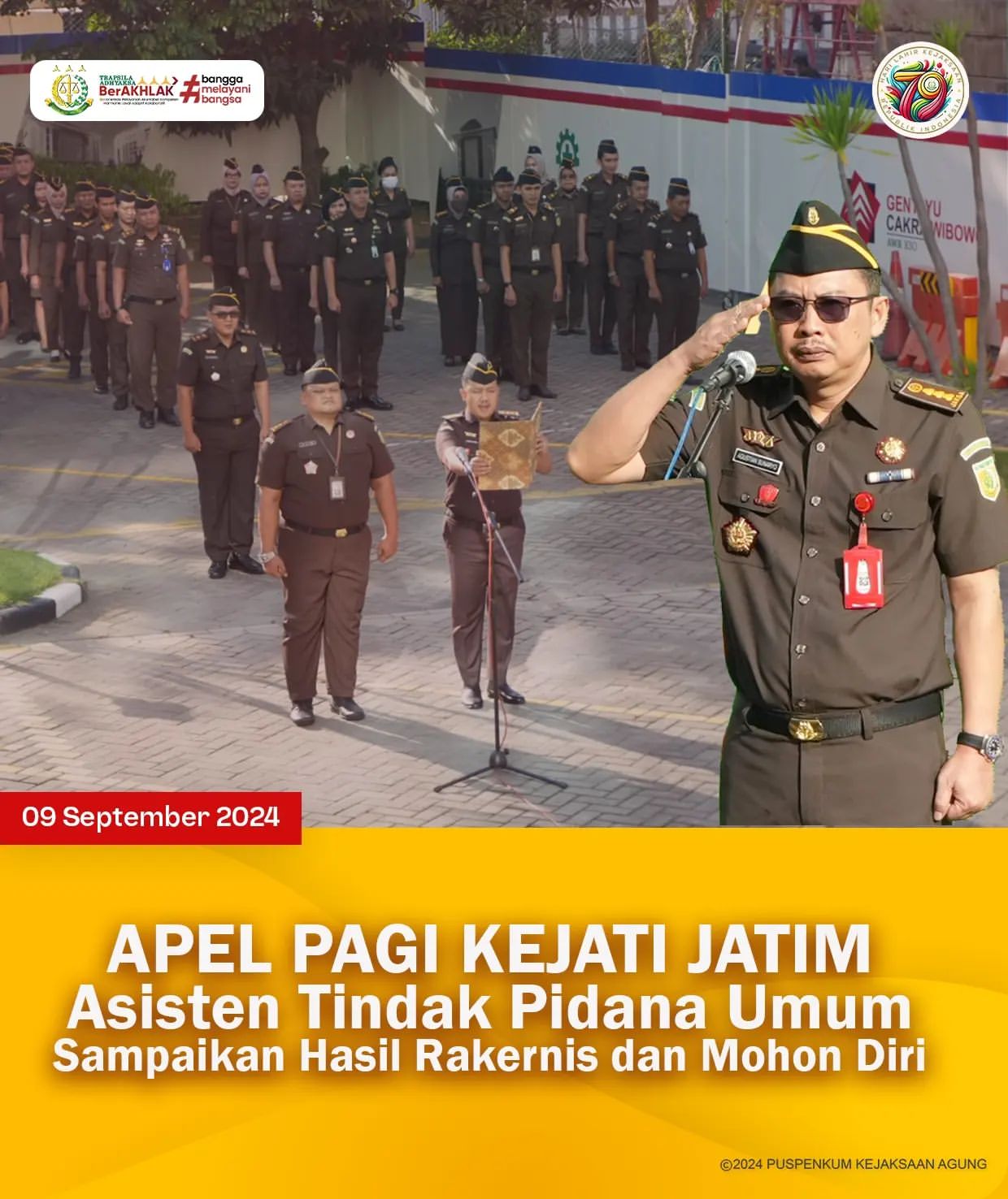 Surabaya – Pada hari Senin, 9 September 2024, Kejaksaan Tinggi Jawa Timur (Kejati Jatim) mengadakan apel pagi rutin yang diikuti oleh seluruh pegawai di halaman kantor. Apel ini berlangsung dengan penuh khidmat dan bertujuan untuk memperkuat tali persaudaraan antar pegawai.