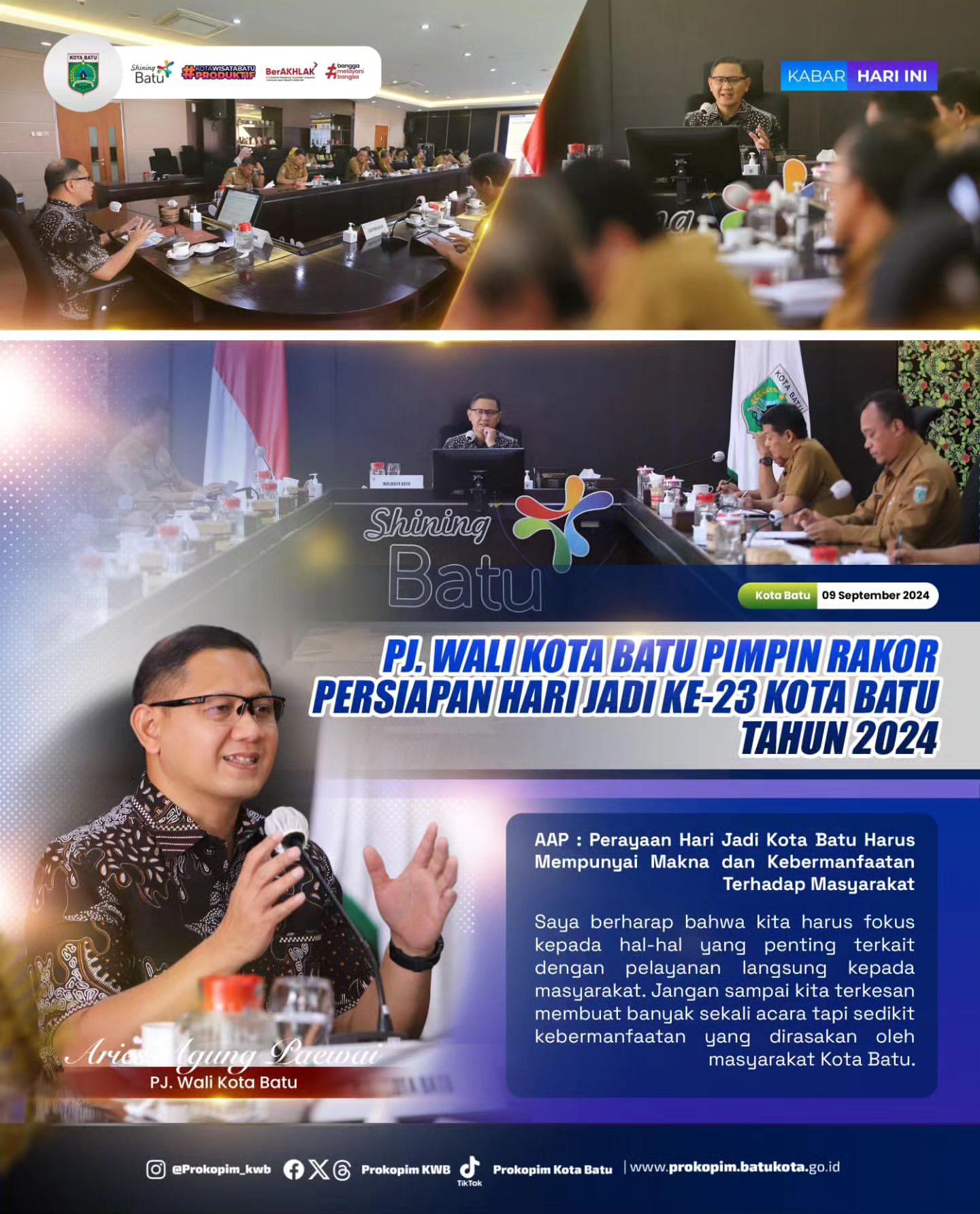 Pemerintah Kota Batu mengadakan rapat koordinasi untuk merencanakan perayaan Hari Jadi Kota Batu yang ke-23. Hari Jadi ini akan dilaksanakan pada tanggal 17 Oktober 2024. Dalam persiapan tersebut, telah direncanakan sekitar 29 acara yang akan diadakan, termasuk acara berskala nasional.