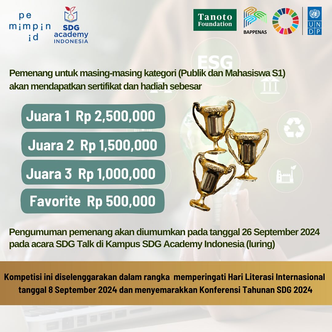 Menyambut Hari Literasi Internasional dan Konferensi Tahunan SDGs Tahun 2024, SDG Academy Indonesia mengadakan Kompetisi Menulis yang terbuka bagi mahasiswa dan masyarakat umum. Kompetisi ini khusus ditujukan untuk peserta yang berusia 17 tahun ke atas.