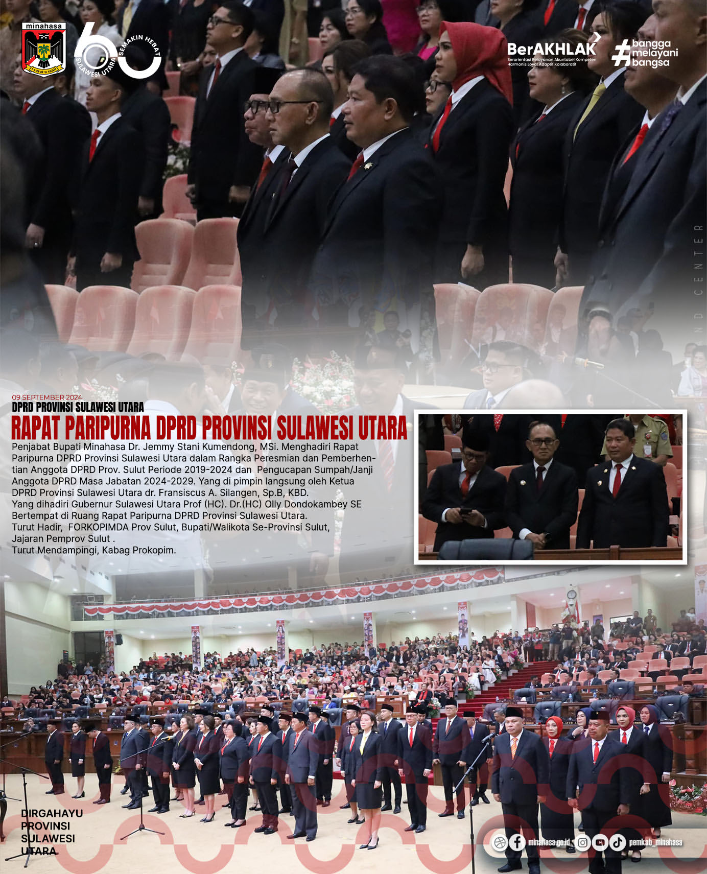 Penjabat Bupati Minahasa, Dr. Jemmy Stani Kumendong, M.Si., menghadiri Rapat Paripurna Dewan Perwakilan Rakyat Daerah (DPRD) Provinsi Sulawesi Utara terkait peresmian dan pemberhentian anggota DPRD untuk periode 2019-2024. Acara tersebut juga mencakup pengucapan sumpah/janji anggota DPRD masa jabatan 2024-2029.