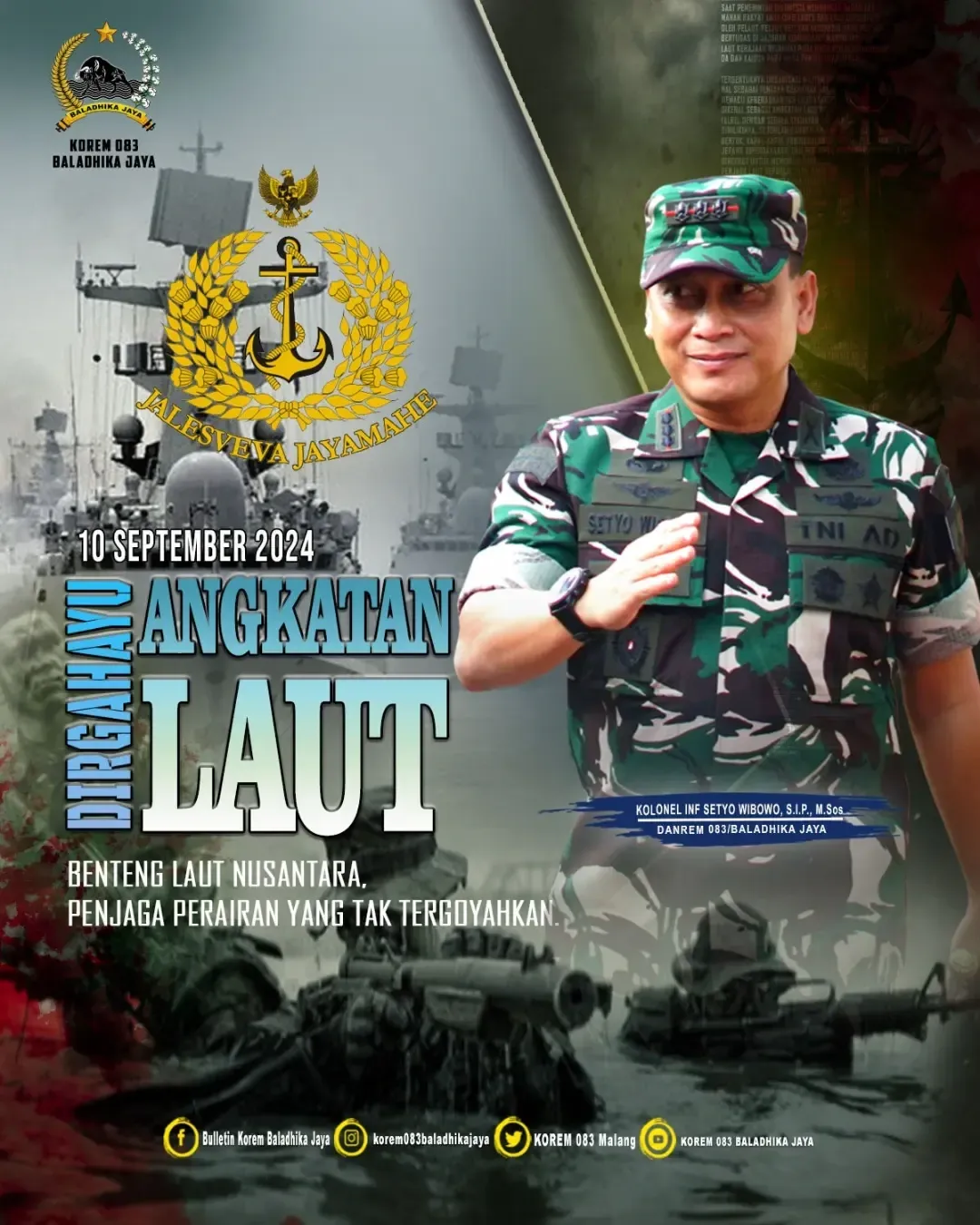 Selamat Hari Jadi TNI Angkatan Laut telah disambut dengan antusiasme oleh seluruh anggota Korem 083/Bdj, serta para prajurit lainnya di seluruh Indonesia. Dalam upaya bersama ini, mereka berharap untuk terus bersinergi dengan masyarakat demi menjaga keamanan NKRI (Negara Kesatuan Republik Indonesia).