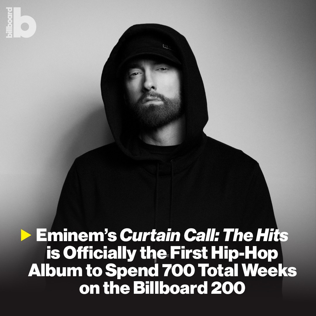 Album compilation terbaik milik rapper terkenal, Eminem, berjudul 'Curtain Call: The Hits' yang dirilis pada tahun 2005, telah mencapai tonggak sejarah penting. Album ini kini resmi bergabung dengan daftar eksklusif yang terdiri dari hanya lima album lainnya yang telah menghabiskan 700 minggu atau lebih di tangga lagu Billboard 200.