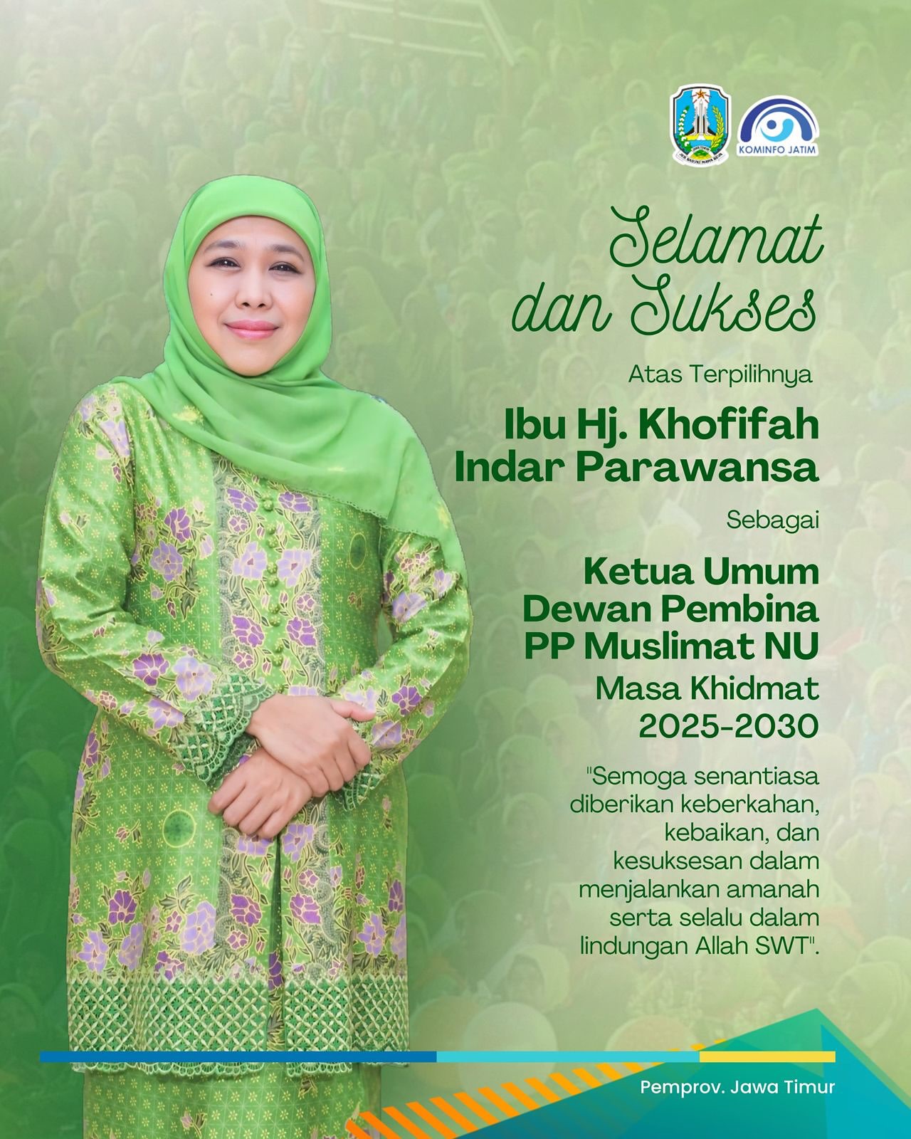 Surabaya, 16 Februari 2025 – Ibu Hj. Khofifah Indar Parawansa telah terpilih sebagai Ketua Umum Dewan Pembina PP Muslimat NU untuk masa khidmat 2025-2030. Pengumuman ini disampaikan oleh Pemerintah Provinsi Jawa Timur yang mengucapkan selamat dan sukses atas terpilihnya beliau.