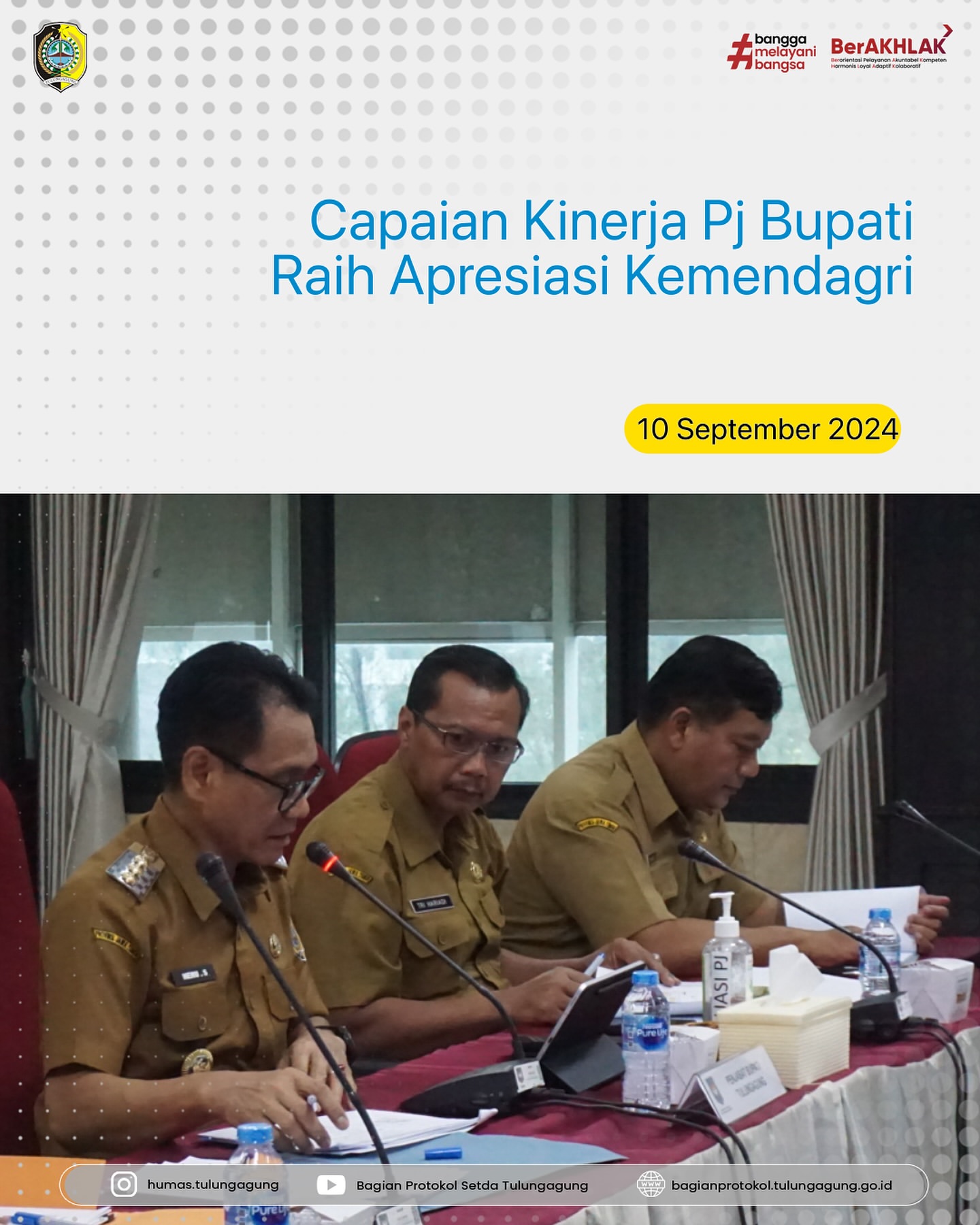 Pada hari Selasa, 10 September 2024, Penjabat Bupati Tulungagung, Dr. Ir. Heru Suseno, MT, bersama Sekretaris Daerah Kabupaten Tulungagung dan tim dari Organisasi Perangkat Daerah (OPD) terkait, mengikuti evaluasi kinerja penjabat kepala daerah di Jakarta. Kegiatan ini dilaksanakan oleh Inspektorat Jenderal Kementerian Dalam Negeri (Kemendagri).