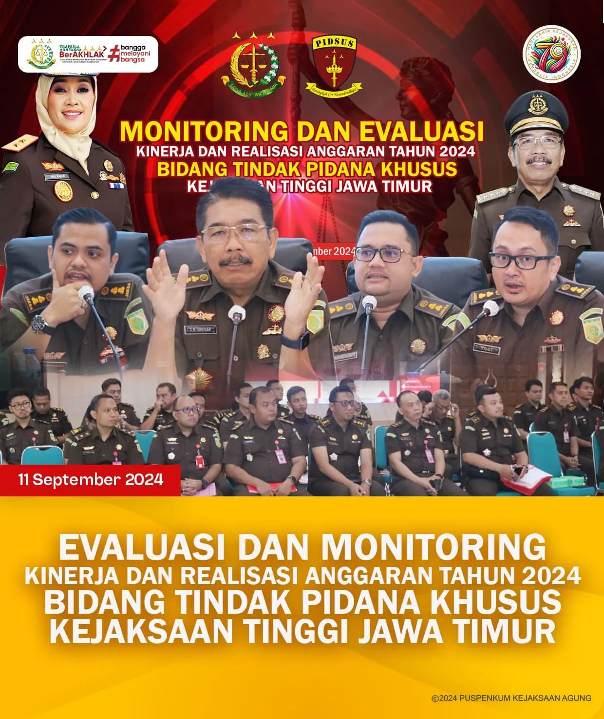 Pada hari Selasa, 10 September 2024, Kejaksaan Tinggi Jawa Timur (Kejati Jatim) mengadakan kegiatan Evaluasi dan Monitoring Kinerja serta Realisasi Anggaran Tahun 2024. Kegiatan ini dibuka oleh Asisten Tindak Pidana Khusus, Bapak Saiful Bahri Siregar, SH., MH., yang dihadiri oleh Kasi Pidsus dan staf dari seluruh Kejaksaan Negeri se-Jawa Timur. Acara berlangsung di Aula Sasana Adhyaksa Kejati Jatim.