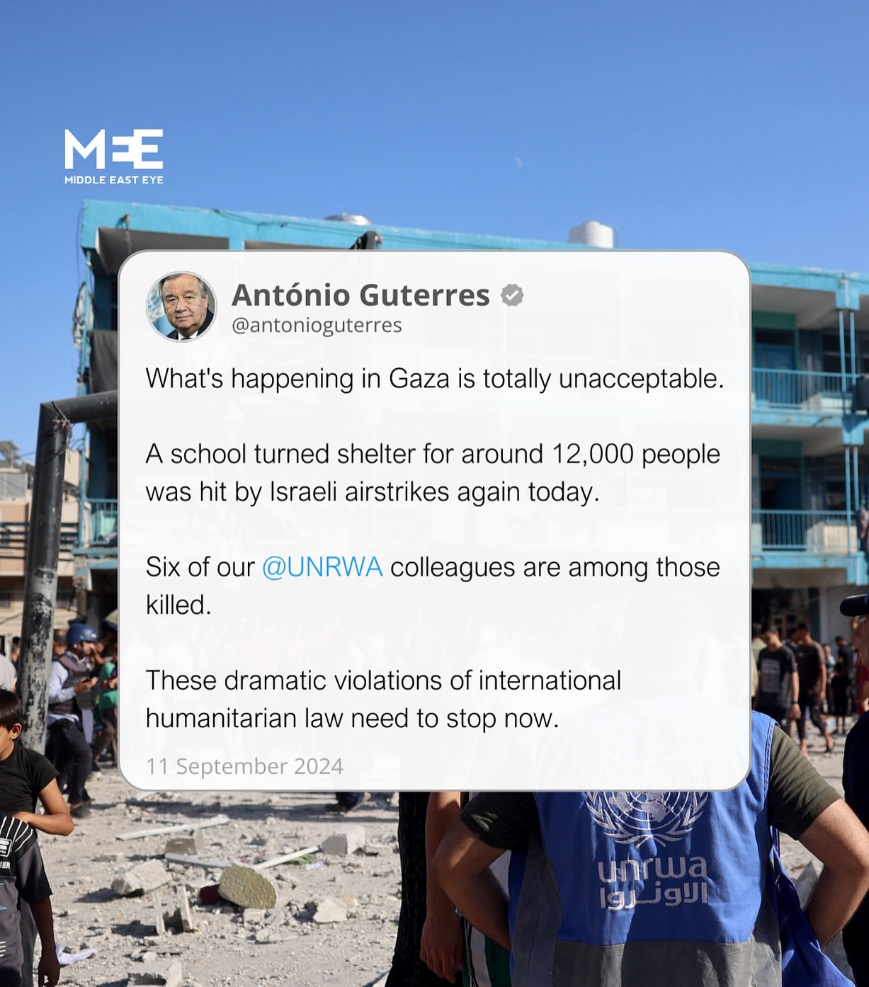 Pada hari Rabu, Israel melancarkan serangan udara di sebuah sekolah yang telah dialihfungsikan menjadi tempat perlindungan di Gaza bagian tengah. Akibat serangan ini, setidaknya 18 orang kehilangan nyawa, termasuk enam staf dari Badan PBB untuk Pengungsi Palestina (UNRWA).