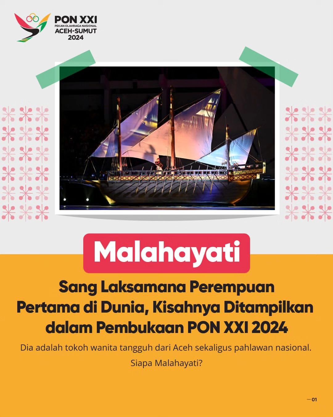 Pembukaan Pekan Olahraga Nasional (PON) XXI Aceh-Sumut berlangsung dengan meriah pada malam 9 September 2024. Acara ini menampilkan beragam atraksi spektakuler yang menarik perhatian banyak orang. Salah satu atraksi yang paling menonjol adalah tarian kolosal yang menggambarkan perjuangan seorang Laksamana perempuan bernama Malahayati.
