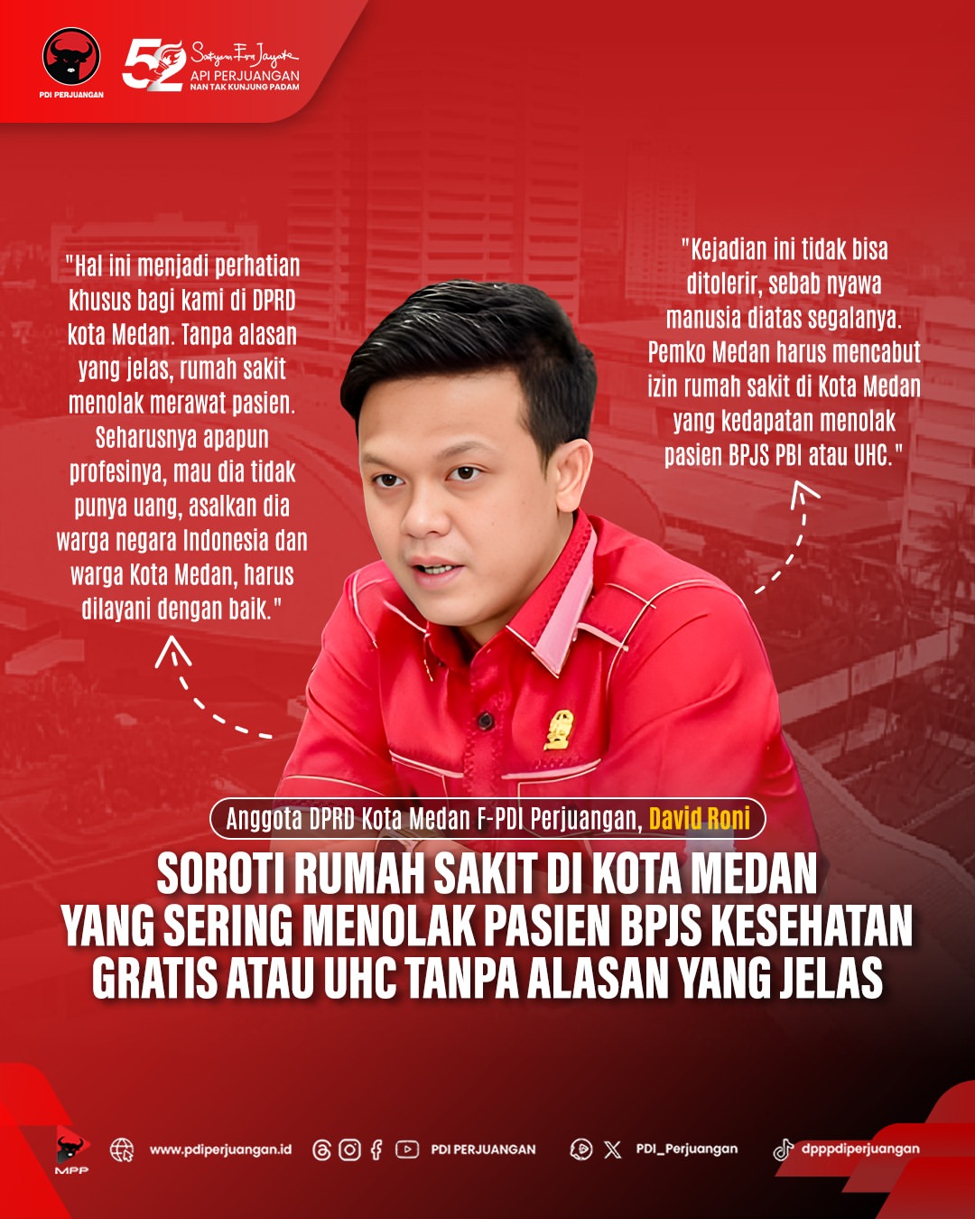 Medan, 24 Februari 2025 - Anggota DPRD Kota Medan dari Fraksi PDI Perjuangan, David Roni, mengungkapkan keprihatinannya terhadap sikap beberapa rumah sakit di Kota Medan yang sering menolak pasien yang menggunakan kartu BPJS Kesehatan gratis atau Program Jaminan Kesehatan Nasional (UHC). Penolakan ini sering terjadi tanpa alasan yang jelas.