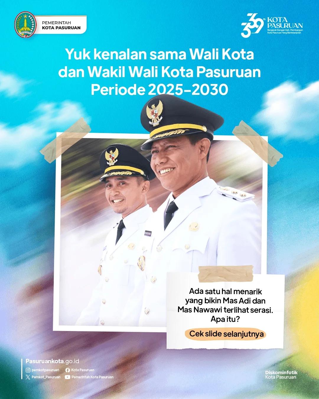 Pasuruan, 28 Februari 2025 – Kota Pasuruan kini memiliki pemimpin baru. Mas Adi Wibowo terpilih sebagai Wali Kota, sementara Mas Nawawi menjadi Wakil Wali Kota untuk periode 2025-2030. Keduanya diharapkan dapat membawa perubahan positif bagi kota yang dikenal sebagai Kota Anugrah.