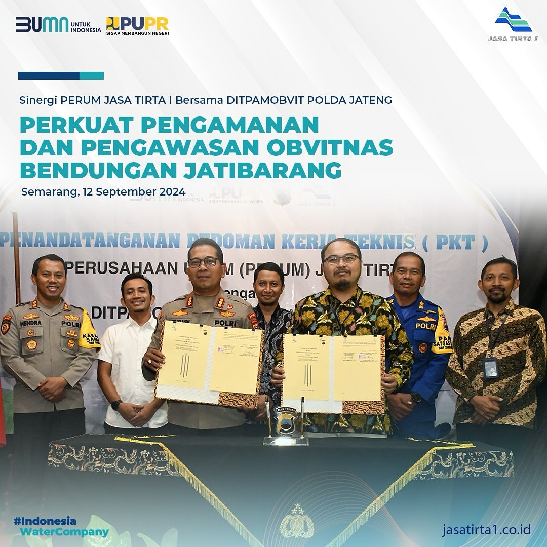 Perum Jasa Tirta I (PJT I) dan Direktorat Pengamanan Objek Vital (DITPAMOBVIT) Kepolisian Daerah Jawa Tengah (Polda Jateng) telah berkolaborasi untuk memperkuat pengamanan Bendungan Jatibarang. Pada tanggal 12 September 2024, kedua pihak menandatangani Pedoman Kerja Teknis (PKT) di Hotel Grasia, Semarang.