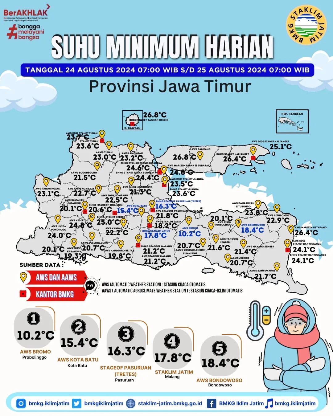 Halo sobat iklim, ada kabar terbaru dari kondisi suhu di Provinsi Jawa Timur. Pada periode 24 Juli hingga 25 Agustus 2024, suhu minimum di daerah tersebut mulai menunjukkan sedikit peningkatan, namun masih terasa sejuk.
