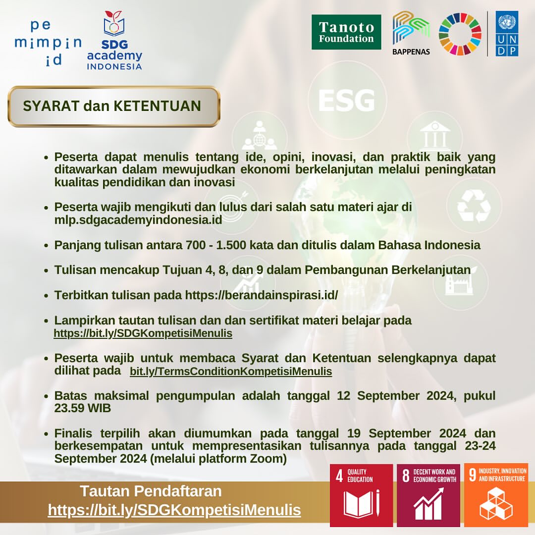 Dalam rangka menyambut Hari Literasi Internasional dan Konferensi Tahunan Tujuan Pembangunan Berkelanjutan (SDGs) Tahun 2024, SDG Academy Indonesia bersama Pemimpin.id mengundang mahasiswa S1 dan publik dari seluruh kalangan dan profesi untuk berpartisipasi dalam Kompetisi Menulis. Kompetisi ini terbuka bagi peserta berusia 17 tahun ke atas.
