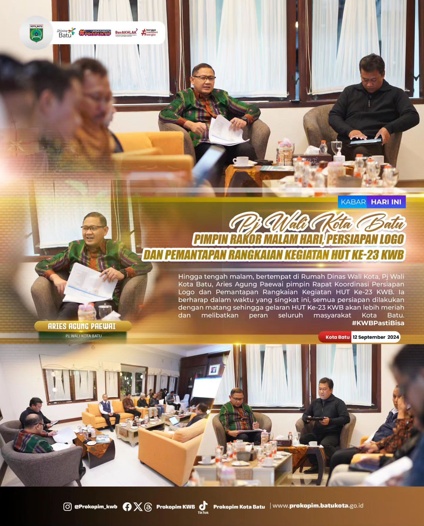 Batu, 13 September 2024 – Pada malam hari yang larut, Pj Wali Kota Batu, Aries Agung Paewai, memimpin Rapat Koordinasi untuk mempersiapkan logo dan rangkaian kegiatan dalam rangka memperingati Hari Ulang Tahun ke-23 Komunitas Warga Batu (KWB). Rapat berlangsung di Rumah Dinas Wali Kota dan dimulai hingga tengah malam.