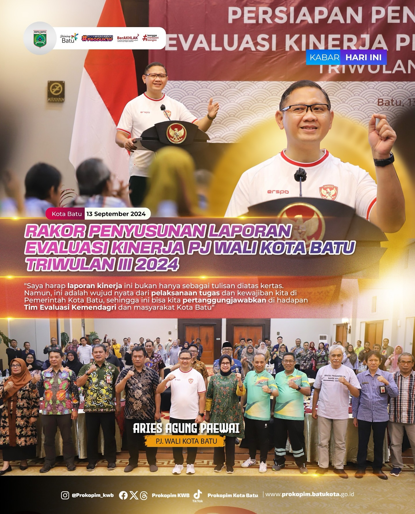 "Saya harap laporan kinerja ini bukan hanya sebagai tulisan di atas kertas. Namun, ini adalah wujud nyata dari pelaksanaan tugas dan kewajiban kita di Pemerintah Kota Batu, sehingga ini bisa kita pertanggungjawabkan di hadapan Tim Evaluasi Kemendagri dan masyarakat Kota Batu," ujar Pj Aries.