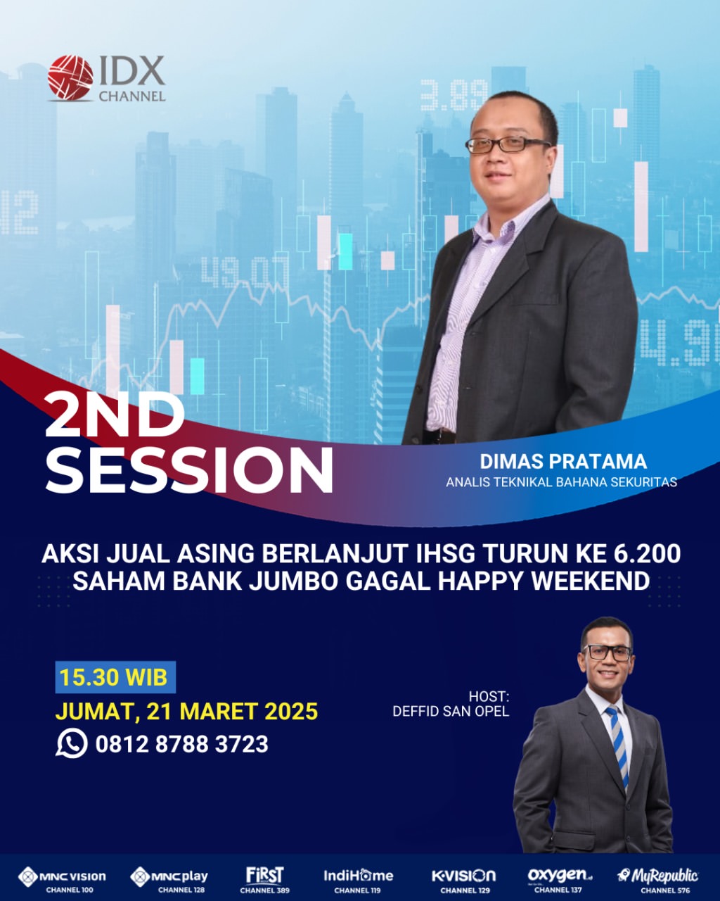 Dengan IHSG yang kembali melemah dan berada di kisaran 6.200-an, banyak yang bertanya-tanya kemana arah pasar selanjutnya. Sektor dan saham apa saja yang masih direkomendasikan di tengah lanjutan pelemahan IHSG ini? Untuk menjawab pertanyaan tersebut, akan ada pembahasan lebih lanjut di IDX 2nd session closing yang akan disiarkan langsung sore ini pukul 15:30 WIB di IDX Channel. Anda bisa menyaksikannya melalui berbagai saluran seperti MNC VISION Channel 100, MNC PLAY Channel 128 HD, INDI HOME Channel 119, FIRST MEDIA Channel 389, K-VISION Channel 129, OXYGEN Channel 137, dan MY REPUBLIK Channel 576. Selain itu, juga tersedia LIVE STREAMING di www.idxchannel.com dan aplikasi IDX Channel TV di APPS store.