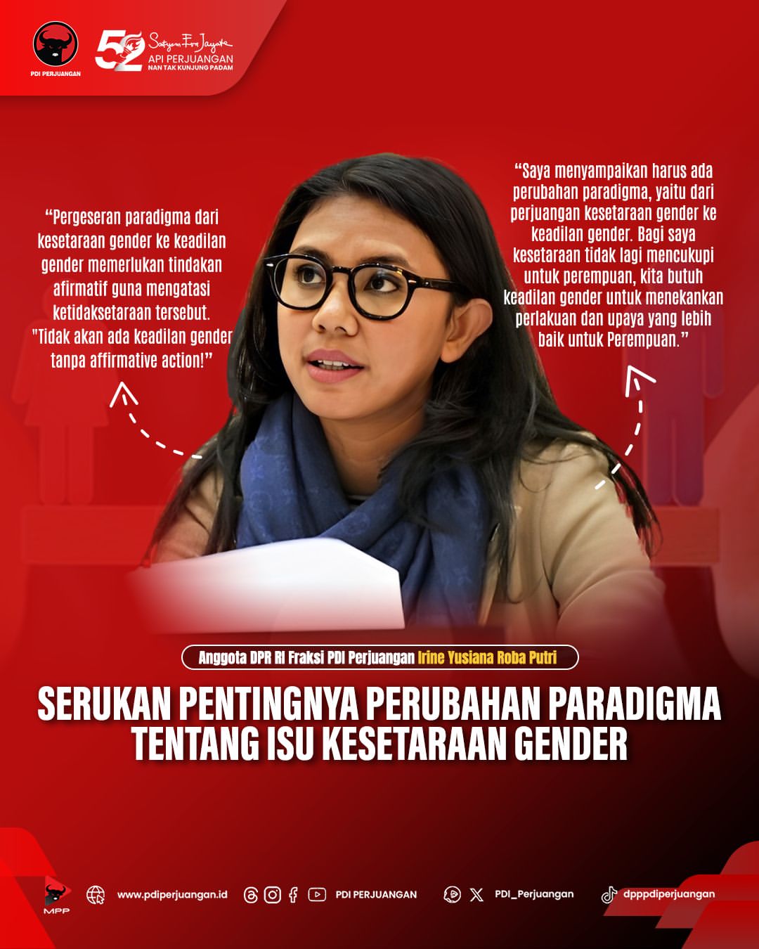 "Angka tersebut belum lah ideal. Kita harus terus berjuang untuk mencapai kesetaraan yang sesungguhnya bagi perempuan di Indonesia," ujar Irine dalam sidang tersebut.