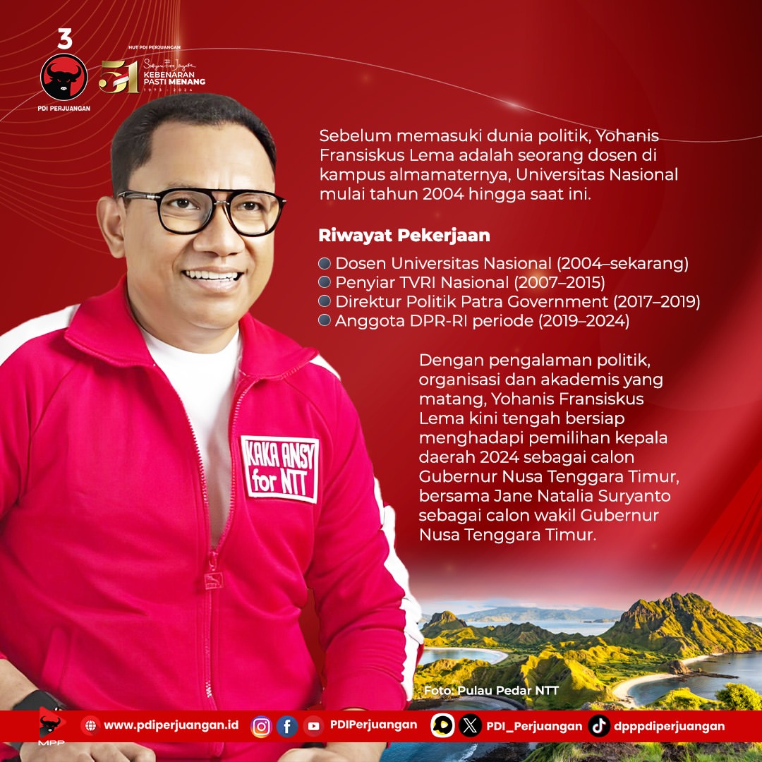 Calon gubernur Nusa Tenggara Timur (NTT), Yohanis Fransiskus Lema, yang lebih dikenal sebagai Ansy Lema, lahir pada 27 Maret 1976. Ansy Lema adalah seorang aktivis reformasi tahun 1998 dan juga politikus Indonesia yang saat ini menjabat sebagai anggota DPR-RI untuk periode 2019 hingga 2024.